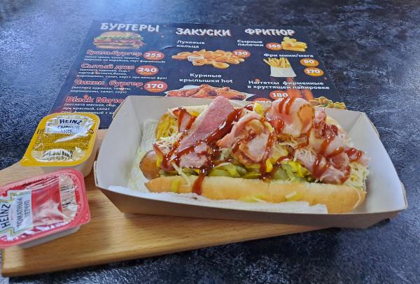 Булочка, сосиска чикен, соус горчичный, салат свежесть, салат из корнишонов, сыр, томаты, бекон жареный