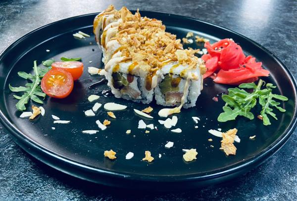 Вип Ролл с начинкой из сливочного сыра, хрустящей дайкона, томат, сверху опаленный тунец, под соусом унаги и лепестками миндаля