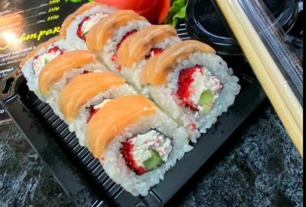 Вип ролл с начинкой из сливочного сыра,свежий огурец, сверху опаленный карамельный лосось, под соусом терияки и икринки летучей рыбы